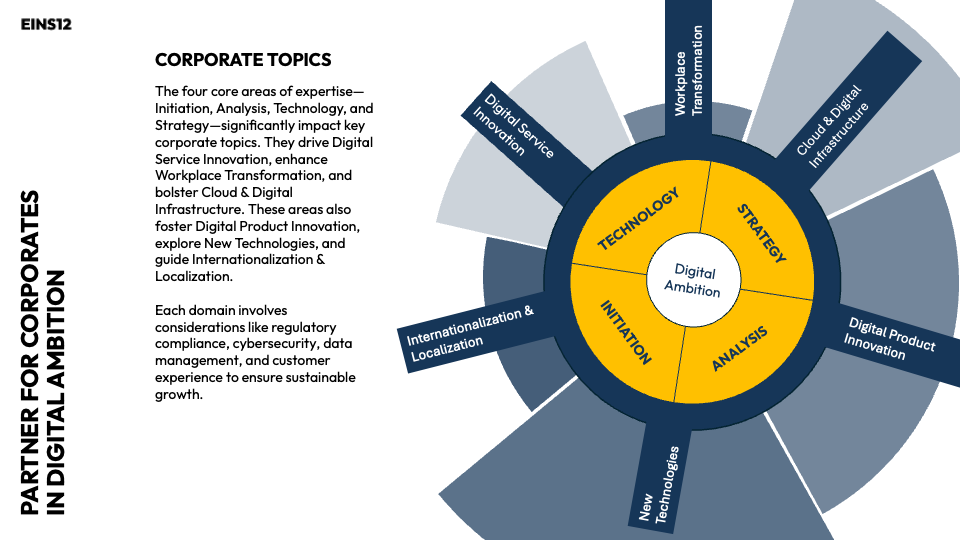 Digital Ambition at corporates encompasses a range of transformative initiatives aimed at driving innovation, efficiency, and growth across various functions. This includes key areas such as Workplace Transformation, Cloud & Digital Infrastructure, Digital Product Innovation, New Technology Adoption, Internationalization and Localization, and Digital Service Innovation. Additionally, Digital Ambition extends to other critical topics like Data-Driven Decision Making, Customer Experience Enhancement, Automation and AI Integration, Cybersecurity and Data Privacy, Sustainability and Green Tech, Digital Talent Development, Ecosystem and Partnership Strategies, Regulatory Compliance and Digital Governance, Agile and DevOps Practices, and Digital Marketing and E-Commerce.